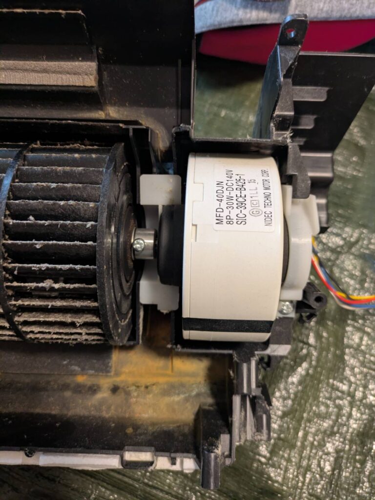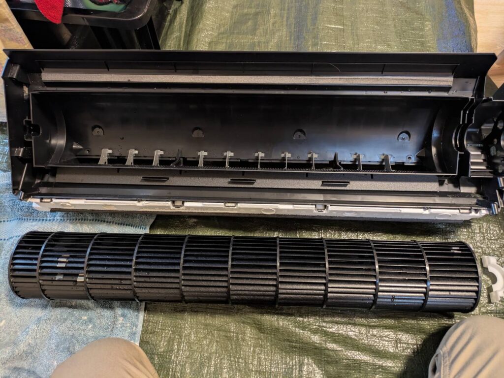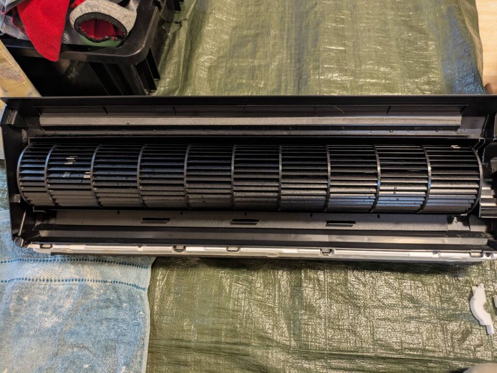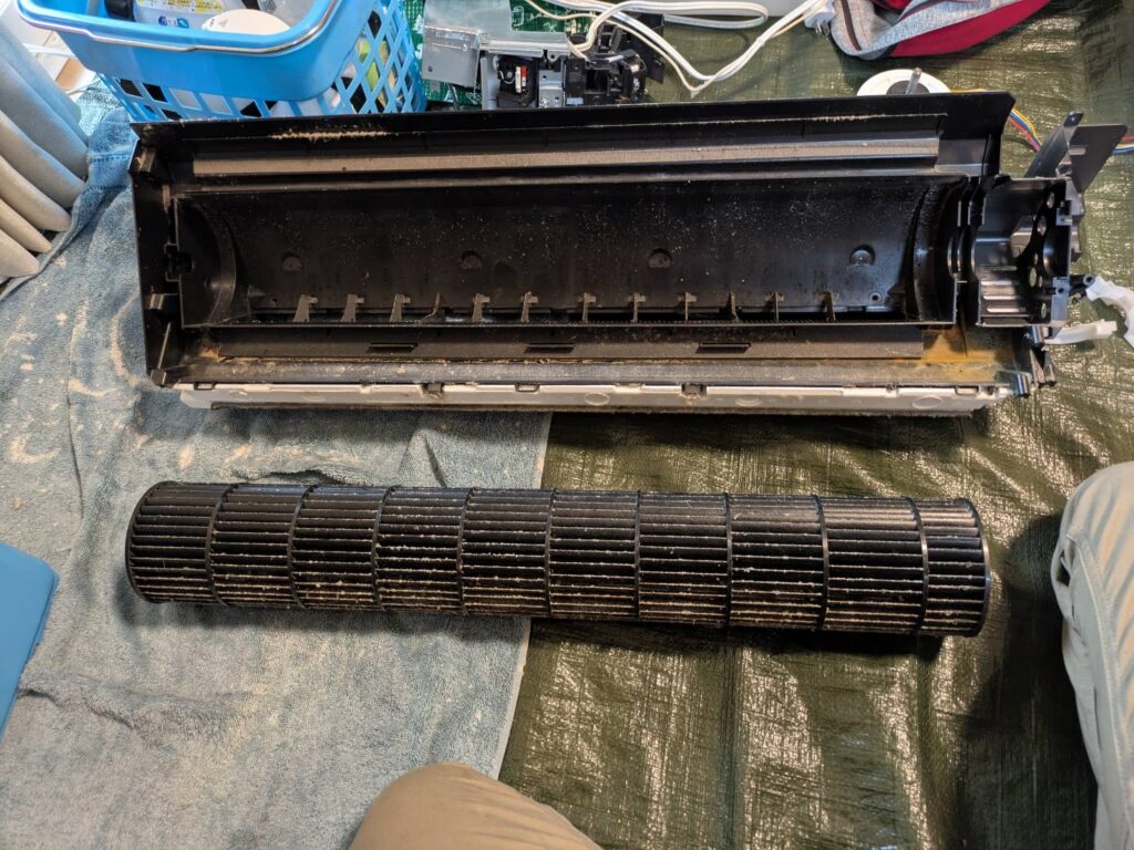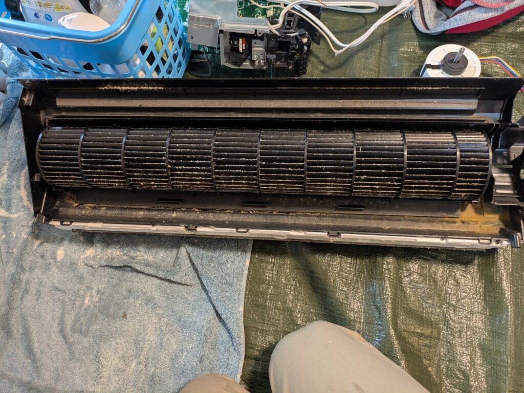 エアコンを新品交換した際にドレンホースは以前のエアコンのを流用したようでホース内は汚れが溜まっておりました(写真撮り忘れ)。ホース内の汚れも高圧洗浄機で一層!エアコン内部もある程度汚れており完全分解で全ての汚れを除去。