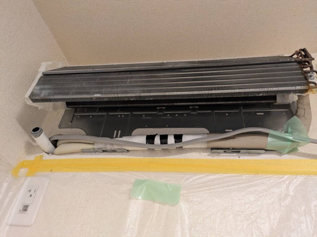 ドレンホースが毎年詰まり室内へ大量の水漏れが発生していたそうです。エアコン内に汚れが溜まっていると思い、中までしっかりとキレイにしたいという事でご依頼を頂きました。